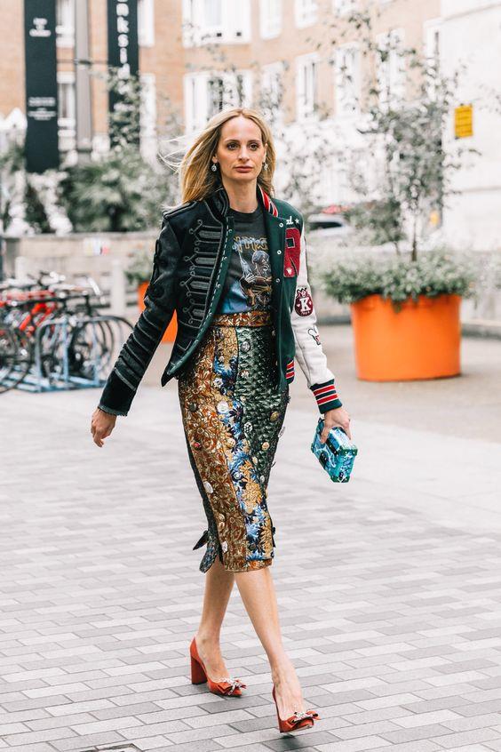 Fotografiada por Diego Anciano, Lauren Santo Domingo, la dueña de Moda Operandi, nos da una lección de cómo mezclar estampados sin parecer que has perdido la cordura. Una chaqueta entre deportiva y militar, una camiseta de la banda británica Iron Maiden (es el semana de la moda de Londres), falda tubo, zapatos de tacón con lazo. ¿Acaso no es perfecto?