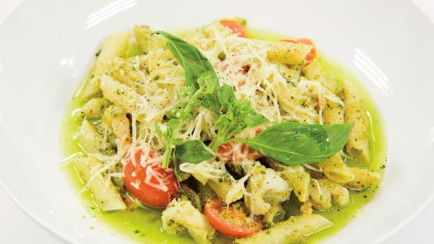 Penne con pesto y camarones rebozados