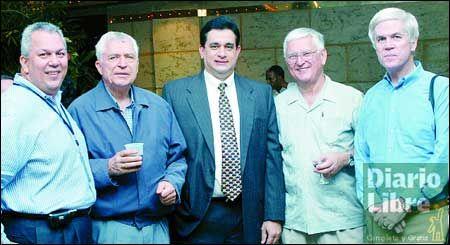 Santo Domingo. Fernando Rodríguez, director corporativo de Casinos E.E.; Hugo Goeggel, Fernando Báez y Peter McCann departen durante el coctel de bienvenida que ofreció Diamante Meliá Casino a la delegación de diferentes países que participaron en la Exposición Mundial de Sellos.