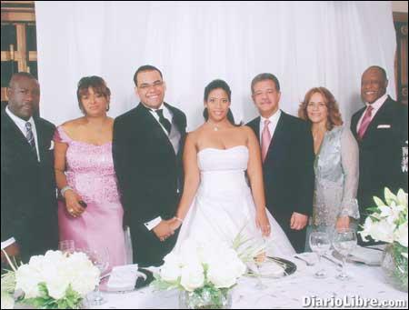 SANTO DOMINGO. Ana Yahira, la más pequeña de las hijas de Johnny Ventura, quien forma parte del coro de su orquesta, contrajo nupcias el pasado 30 de julio, con Julio Anderson Herrera, en una boda íntima, en la que el Presidente Leonel Fernández fue el padrino. En la foto, Yahira y Julio son escoltados por Zacarías y Grecia, padres de Julio, el presidente Fernández, doña Fifa y El Caballo. ¡¡¡Ajáaa!!!