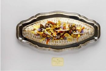 El banquete comienza con un bogavante azul gratinado "a la cardinale", una forma de cocción que consigue que el caparazón sea rojo como las vestimentas de los cardenales, acompañado de una guarnición de trufas negras y sabayon, una especie de natillas aromatizadas con vino.