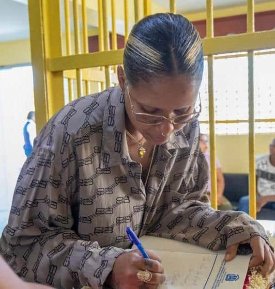 La directora del Centro de Corrección y Rehabilitación de Najayo Mujeres, Virlenis Aquino, recibió a Tokischa, quien acudió al recinto acompañada con parte de su equipo de producción, manejo artístico y comunicaciones.