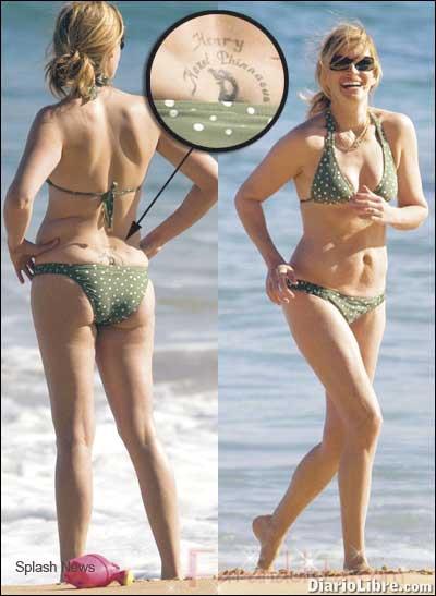 La foto fue tomada por un paparazzi. En ella, la actriz de Hollywood a orillas de una playa en Hawaii, muestra no sólo su pancita, sino el tatuaje grabado en su 'pichirrí' con los nombres de sus hijos, los gemelos de 4 años Phinnaeus y Hazel y Henry, de casi 2 años.