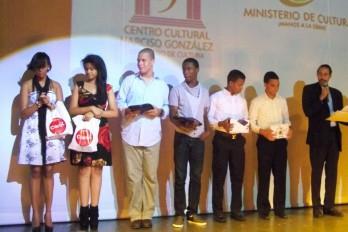 SANTO DOMINGO.- El Ministerio de Cultura, en coordinación con el Centro Cultural Narciso González, hizo entrega de tabletas, minilaptos y celulares a los ganadores de los concursos escolares convocados en mayo, "Rally-Careo Histórico por la Democracia, Libertad e Identidad" y "Poema a mi Patria", en un acto realizado en el Teatro Monina Solá del referido centro cultural.