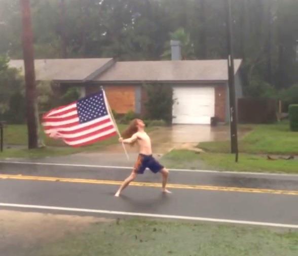 REDACCIÓN. Se ha vuelto viral un video que un usuario de Facebook subió a su perfil de la red social en el que se observa sosteniendo la bandera estadounidense que, al igual que su pelo suelto, se mueve con la fuerza del viento y la lluvia generados por el paso del huracán Matthew por Florida, Estados Unidos.