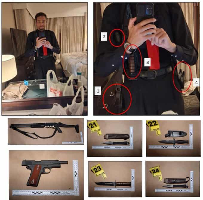 Según los fiscales, al llegar a la habitación del Hilton, Allen escribió sorprendido por lo que consideraba la escasa seguridad del hotel. Dijo que había entrado "con múltiples armas y ni una sola persona aquí contempla la posibilidad de que yo pueda ser una amenaza".