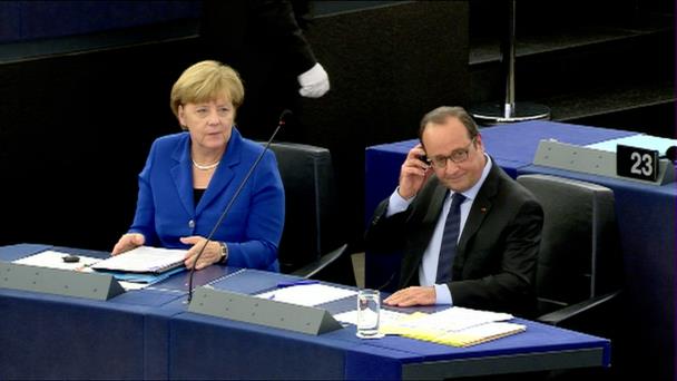 En un discurso conjunto ante la Eurocámara, los mandatarios de Francia y Alemania pidieron este miércoles mayor unidad para enfrentar la crisis de los migrantes y la guerra en Siria.