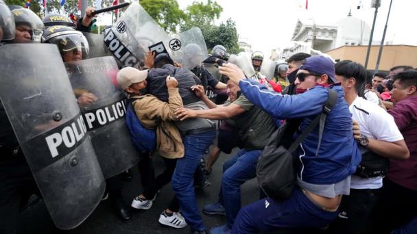 Varias decenas de policías antidisturbios cerraron las avenidas que conducen al Parlamento, para impedir el paso de la protesta. Los manifestantes quemaron pancartas con la imagen de la presidenta Boluarte, al grito de "¡golpista!"